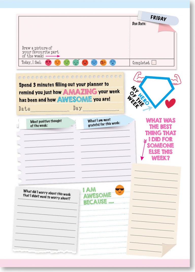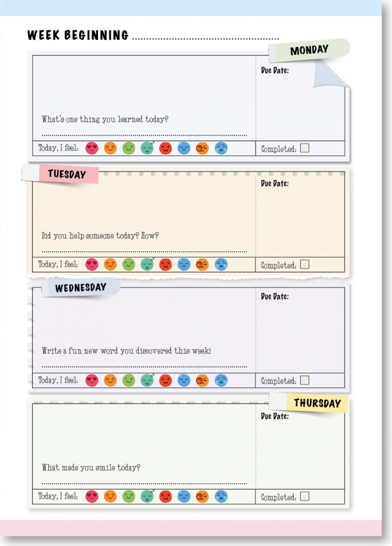 This vibrant and child-friendly planner is packed with positive prompts, helpful learning tools and fun wellness activities designed especially for 6–11 year olds. Each page encourages pupils to: